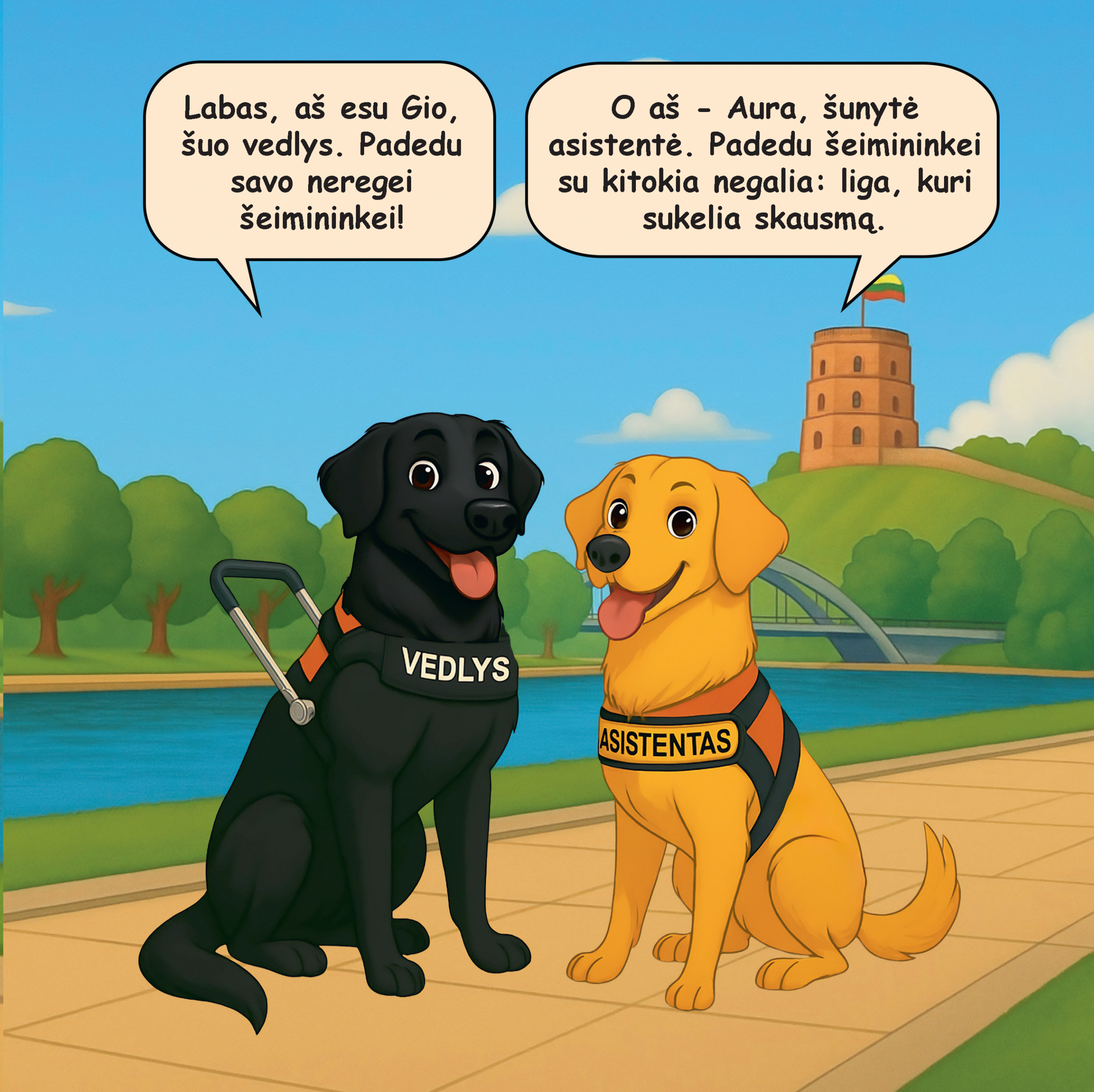 Kietu viršeliu ir ryškiais animuotais paveikslėliais iliustruota knyga yra parašyta kaip istorija apie du šunis – šunį vedlį ir šunytę asistentę. Knyga parašyta linksmos istorijos forma, tačiau šiuo patraukliu formatu siekiama ir edukacinių tikslų – per istoriją atskleidžiama kokios yra šunų pagalbininkų teisės, kaip elgtis, kad netrukdyti šunims pagalbininkams dirbti savo darbą ir kiti svarbūs dalykai.