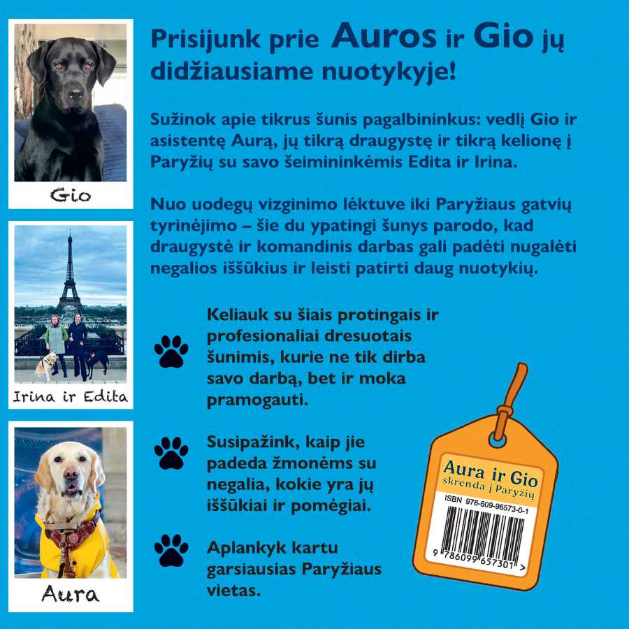 Iliustruota knyga, parašyta kaip dviejų šunų – šuns vedlio ir šunytės asistentės – pasakojimas apie jų kelionę į Paryžių. Per šią istoriją perteikiama ir edukacinė medžiaga apie tai, kas yra šunys pagalbininkai (asistentai ir vedliai), koks jų darbas, ir kokios yra elgesio taisyklės viešoje vietoje sutikus tokius ypatingus šunis.